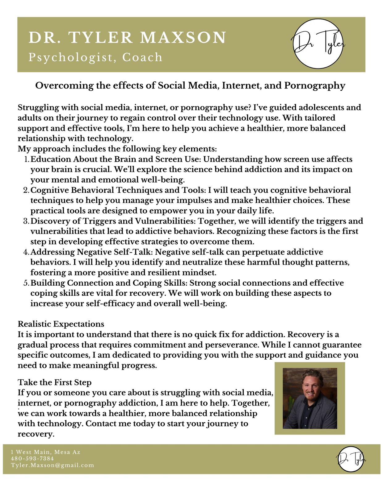 If you or someone you care about is struggling with social media, internet, or pornography, I am here to help. Together, we can work towards a healthier, more balanced relationship with technology. Contact me today to start your journey to recovery.